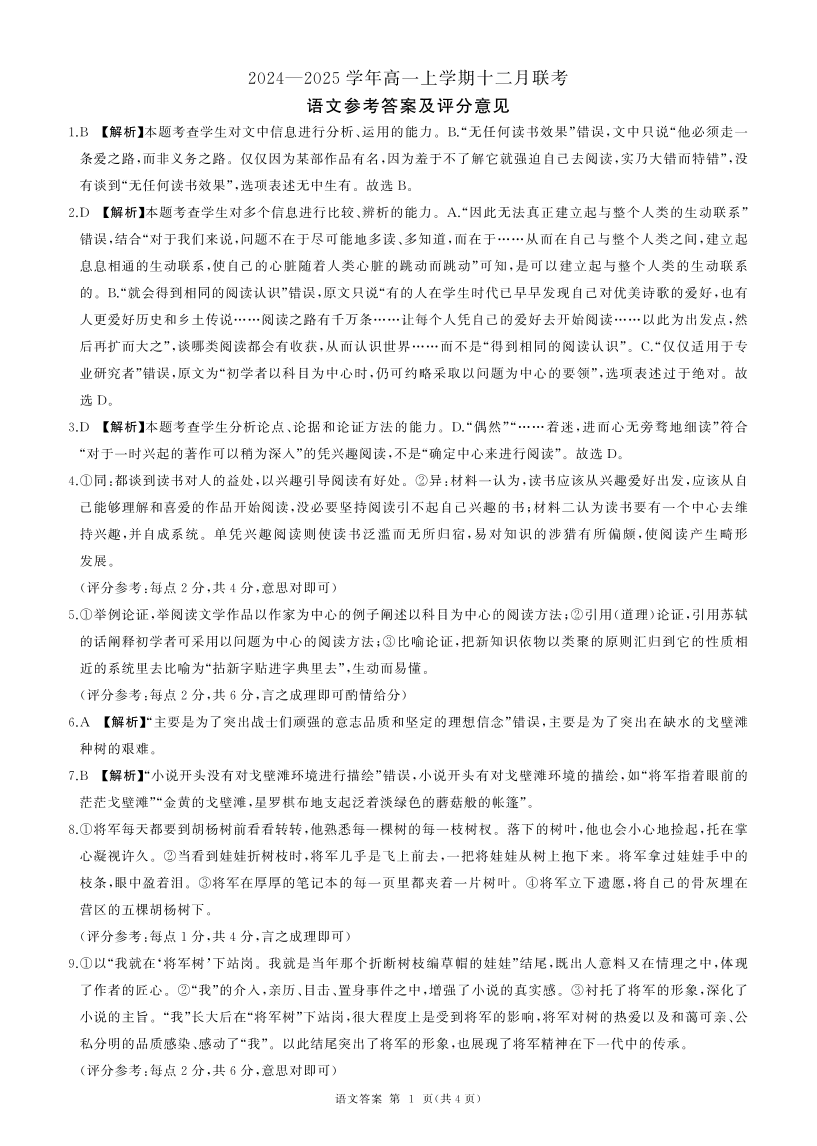 辽宁省朝阳市重点高中2024-2025学年高一上学期12月联考语文答案