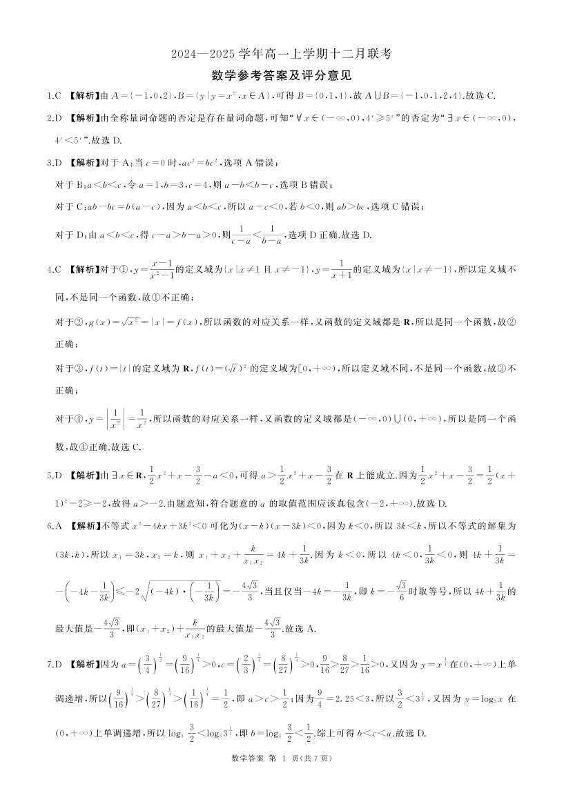 辽宁省朝阳市重点高中2024-2025学年高一上学期12月联考数学答案