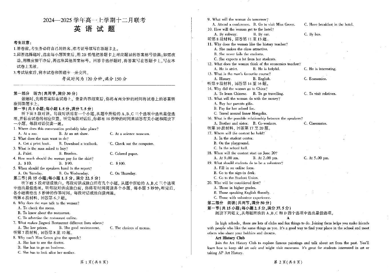 辽宁省朝阳市重点高中2024-2025学年高一上学期12月联考英语