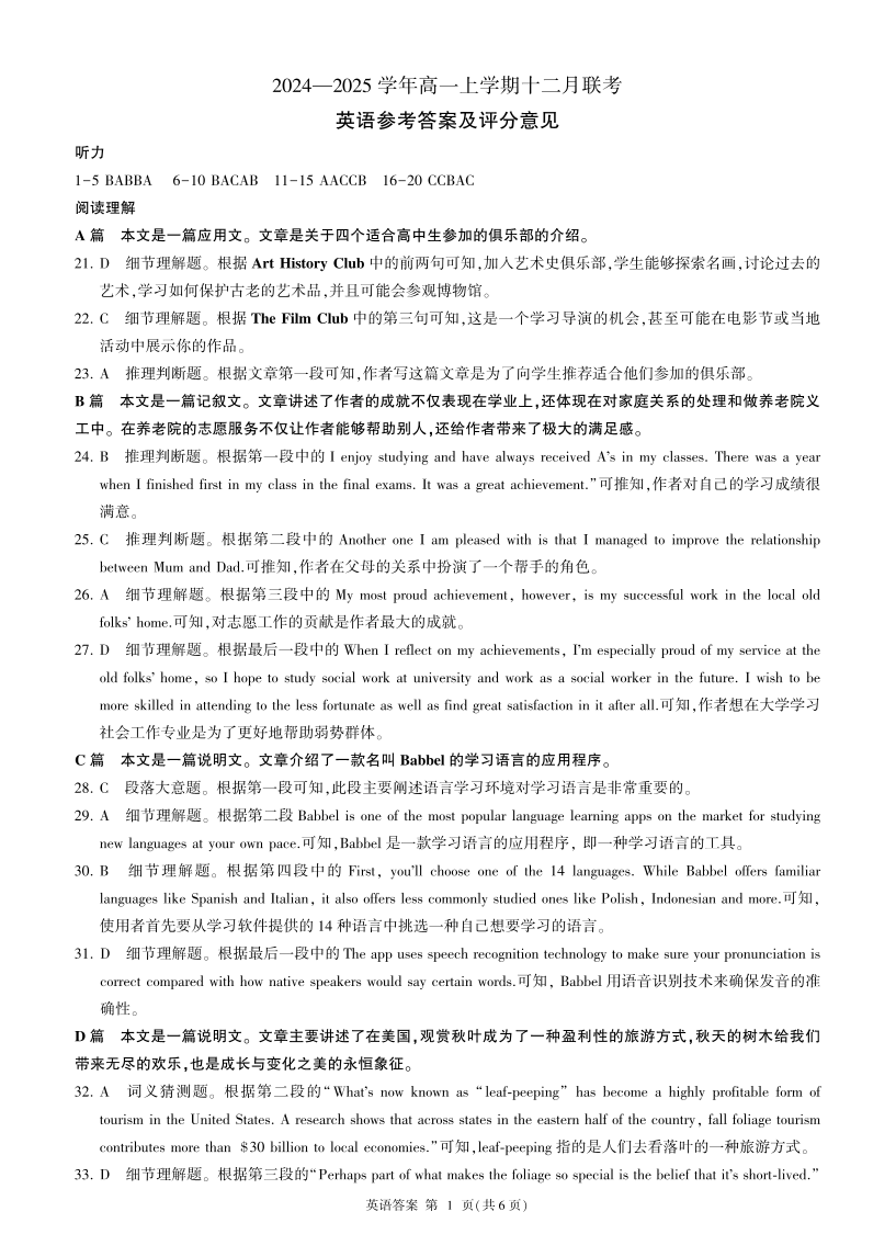 辽宁省朝阳市重点高中2024-2025学年高一上学期12月联考英语答案