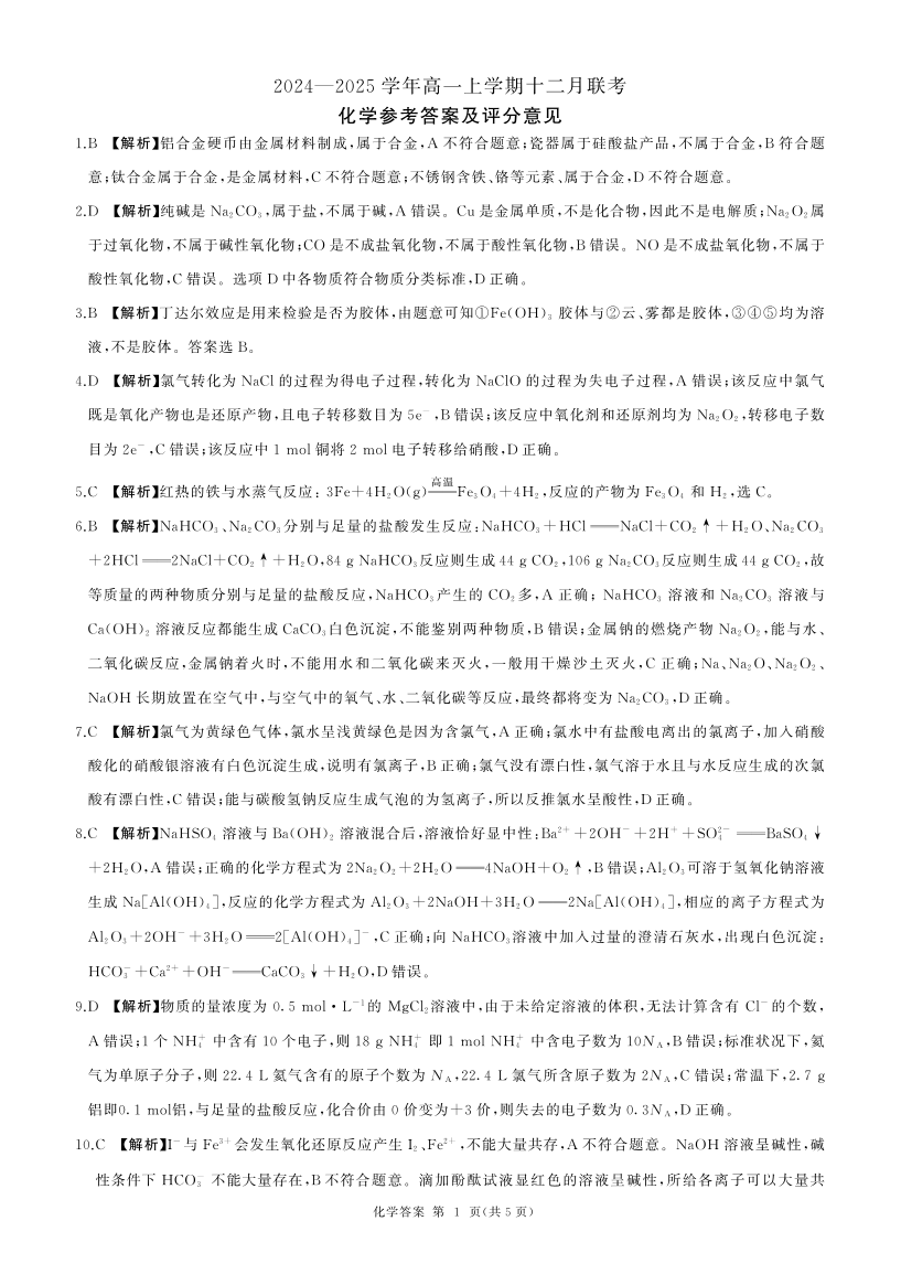 辽宁省朝阳市重点高中2024-2025学年高一上学期12月联考化学答案