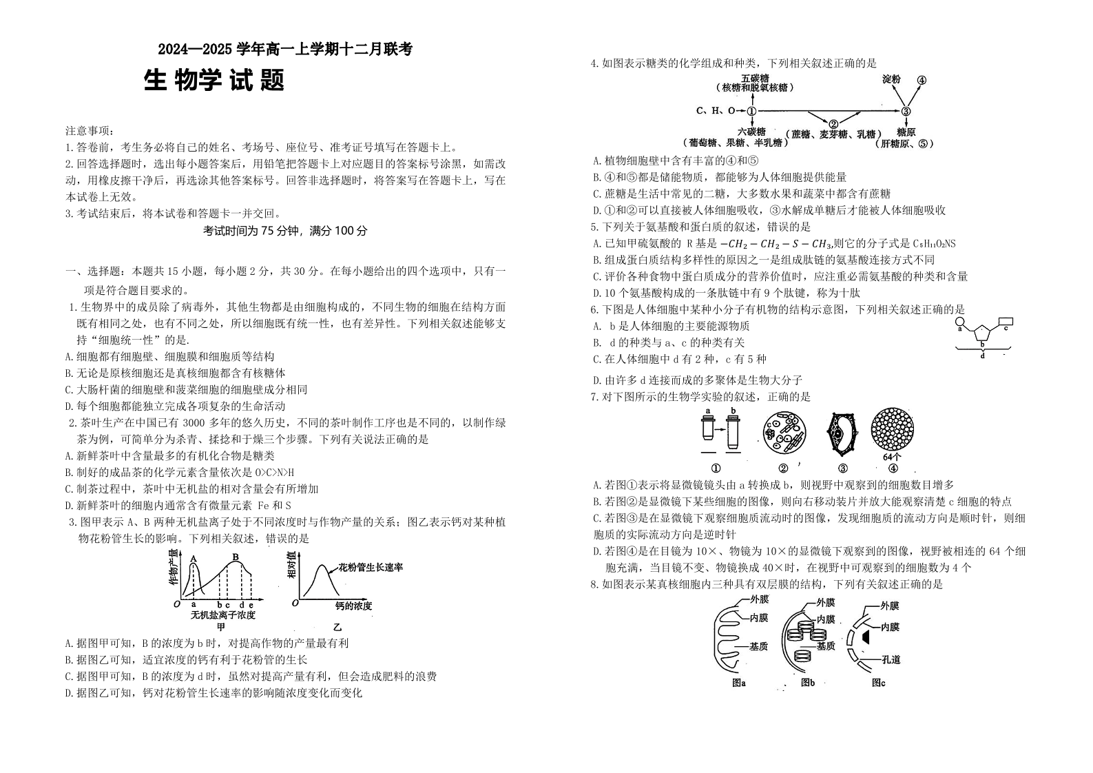 辽宁省朝阳市重点高中2024-2025学年高一上学期12月联考生物