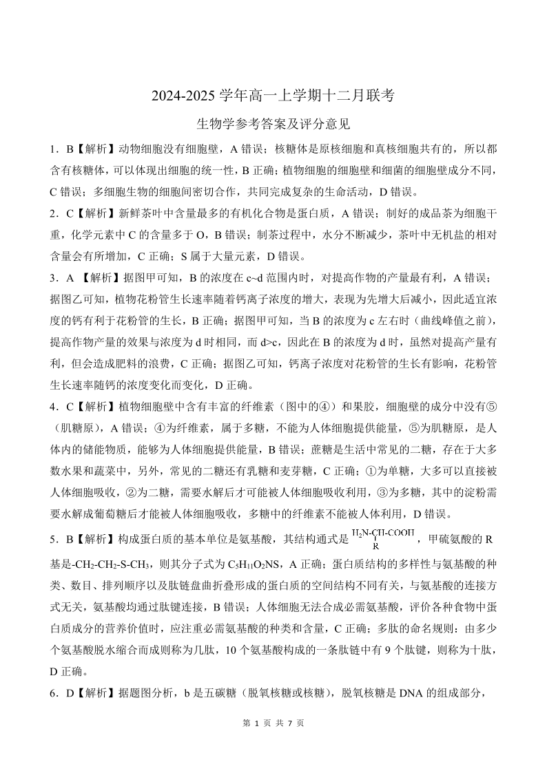 辽宁省朝阳市重点高中2024-2025学年高一上学期12月联考生物答案