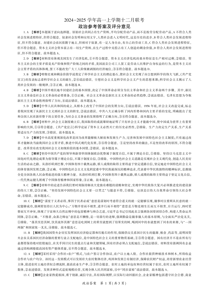 辽宁省朝阳市重点高中2024-2025学年高一上学期12月联考政治答案