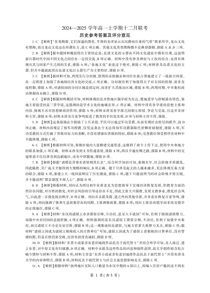 辽宁省朝阳市重点高中2024-2025学年高一上学期12月联考历史答案