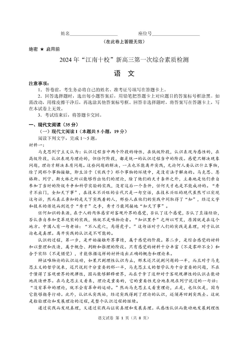 安徽省江南十校2025届新高三第一次综合素质检测语文+答案
