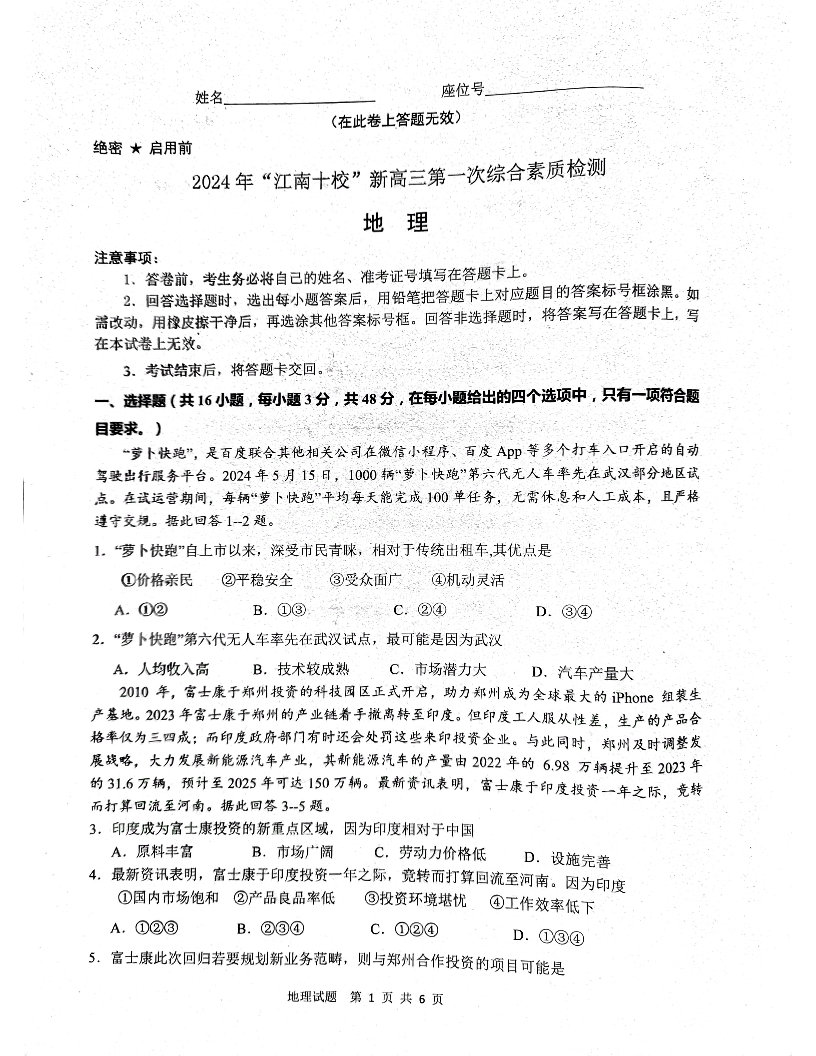 安徽省江南十校2025届新高三第一次综合素质检测地理