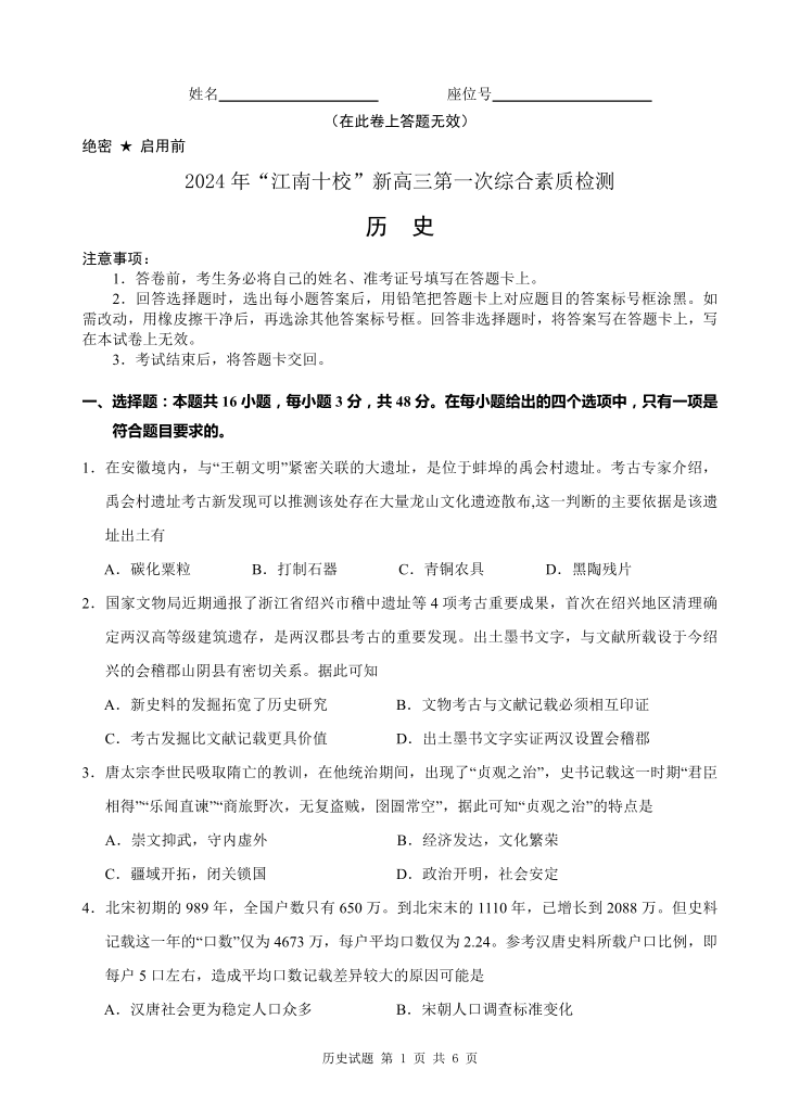 安徽省江南十校2025届新高三第一次综合素质检测历史