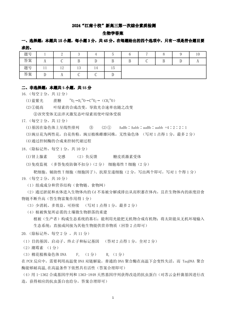 安徽省江南十校2025届新高三第一次综合素质检测生物答案