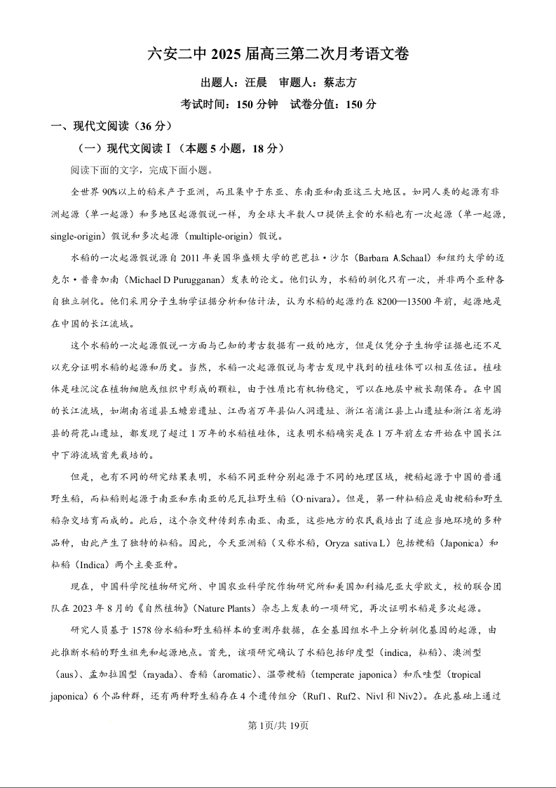 安徽省六安市第二中学2024-2025学年高三上学期10月月考语文答案
