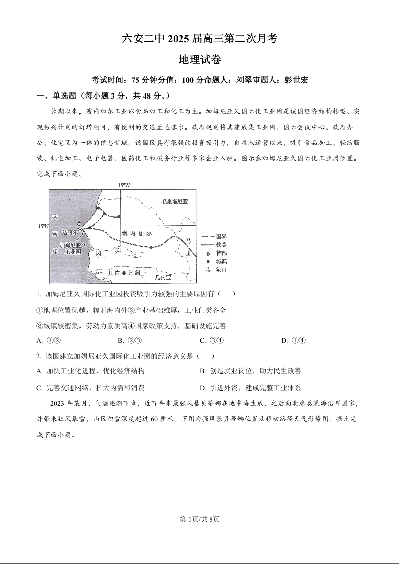 安徽省六安市第二中学2024-2025学年高三上学期10月月考地理