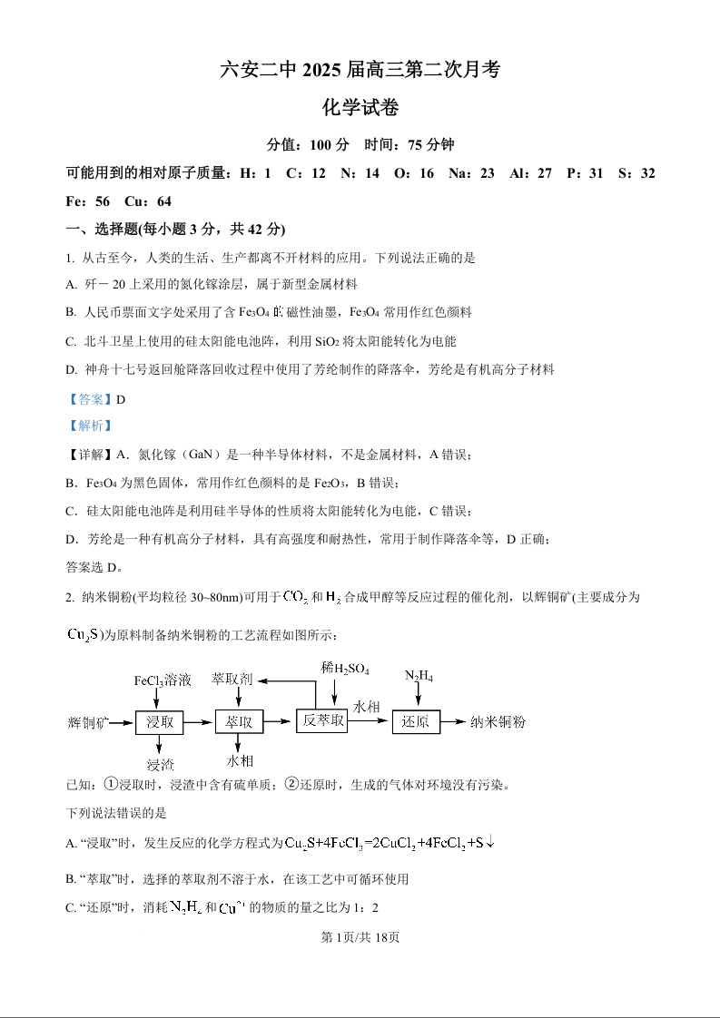 安徽省六安市第二中学2024-2025学年高三上学期10月月考化学答案