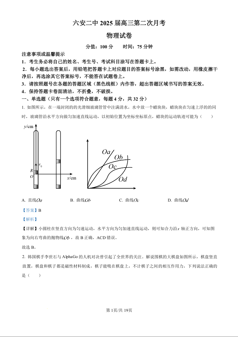 安徽省六安市第二中学2024-2025学年高三上学期10月月考物理答案