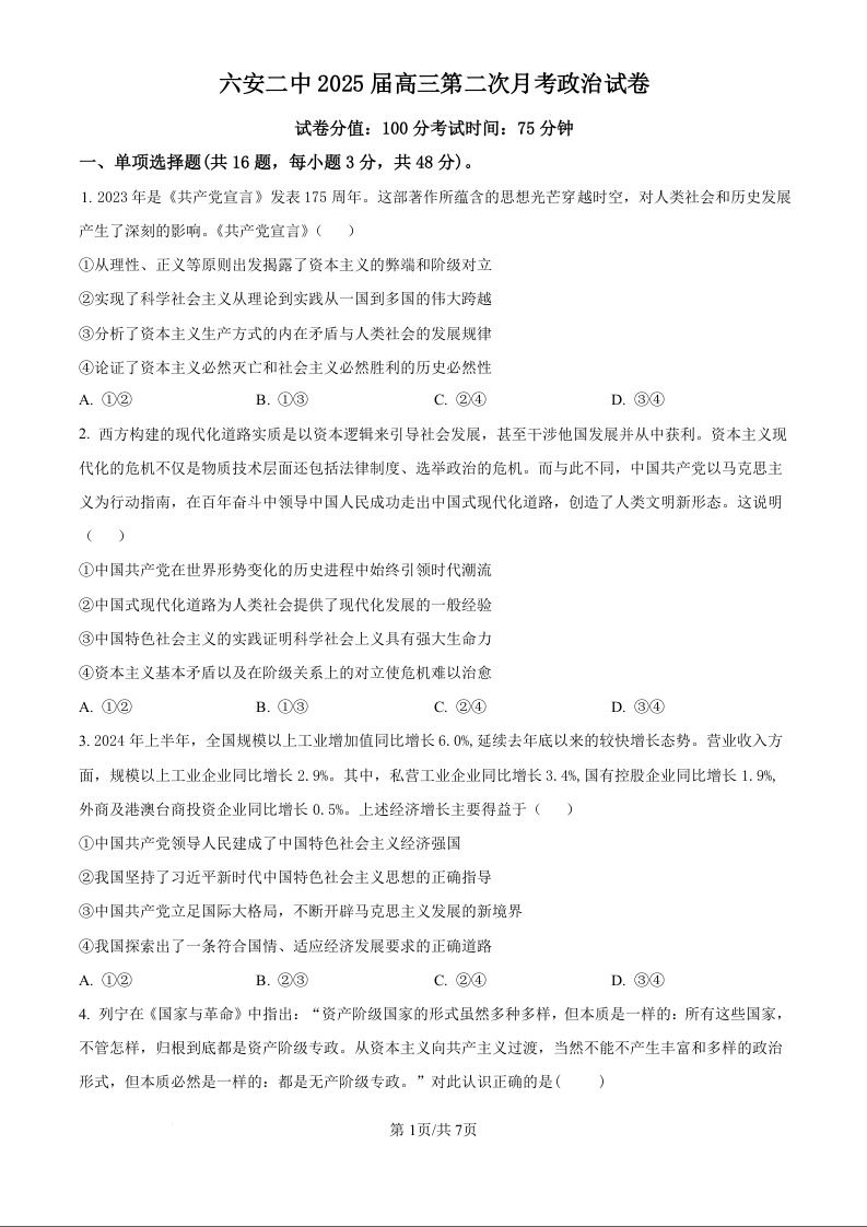 安徽省六安市第二中学2024-2025学年高三上学期10月月考政治