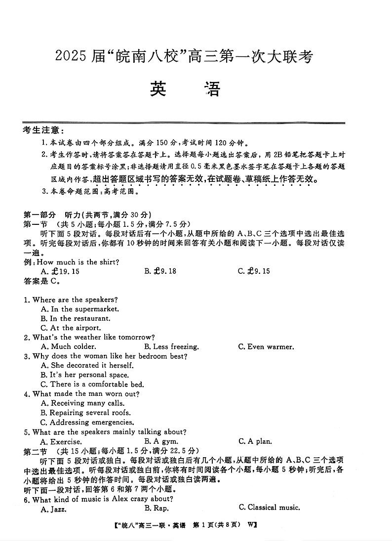 安徽省皖南八校2025届高三第一次大联考英语试卷