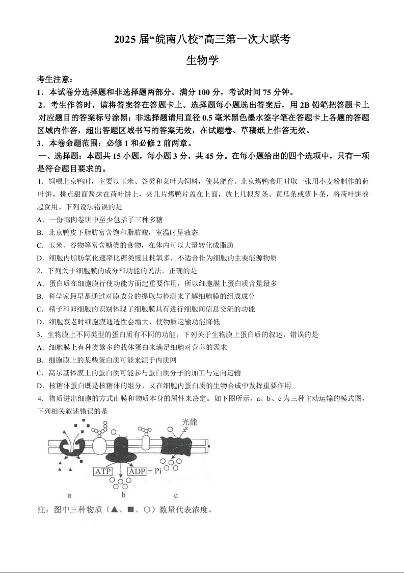 安徽省皖南八校2025届高三第一次大联考生物+答案