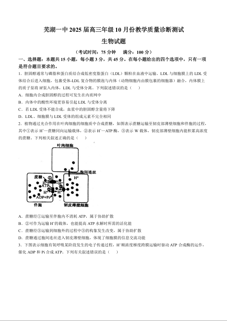 安徽省芜湖市第一中学2025届高三上学期10月份教学质量诊断测试生物+答案