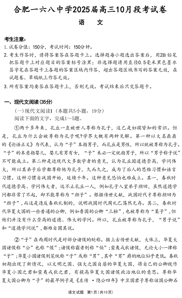 安徽省合肥一六八中学2025届高三上学期10月段考语文+答案