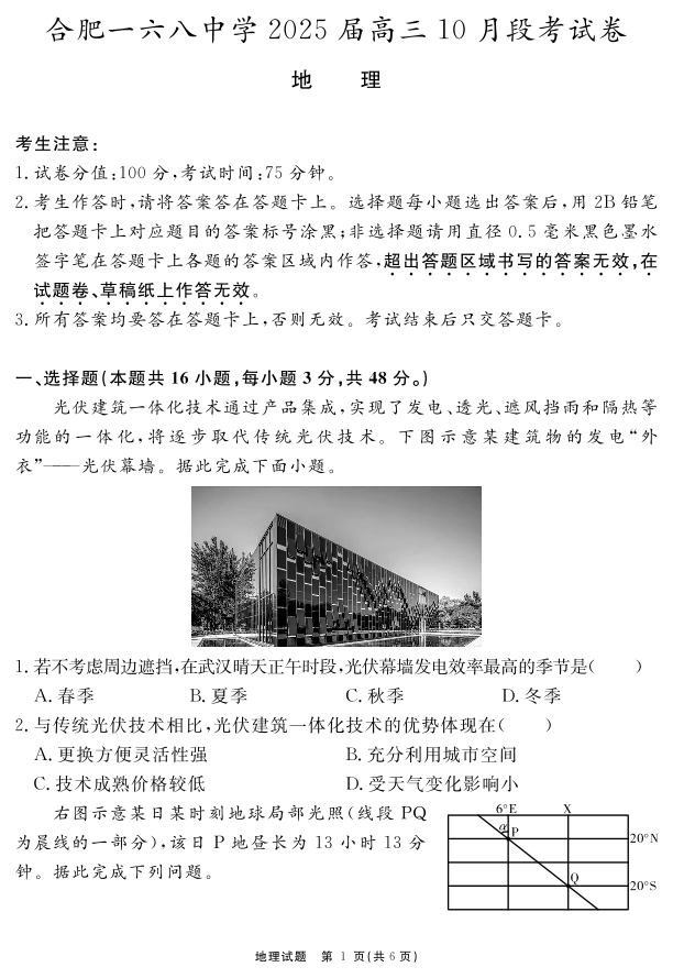 安徽省合肥一六八中学2025届高三上学期10月段考地理