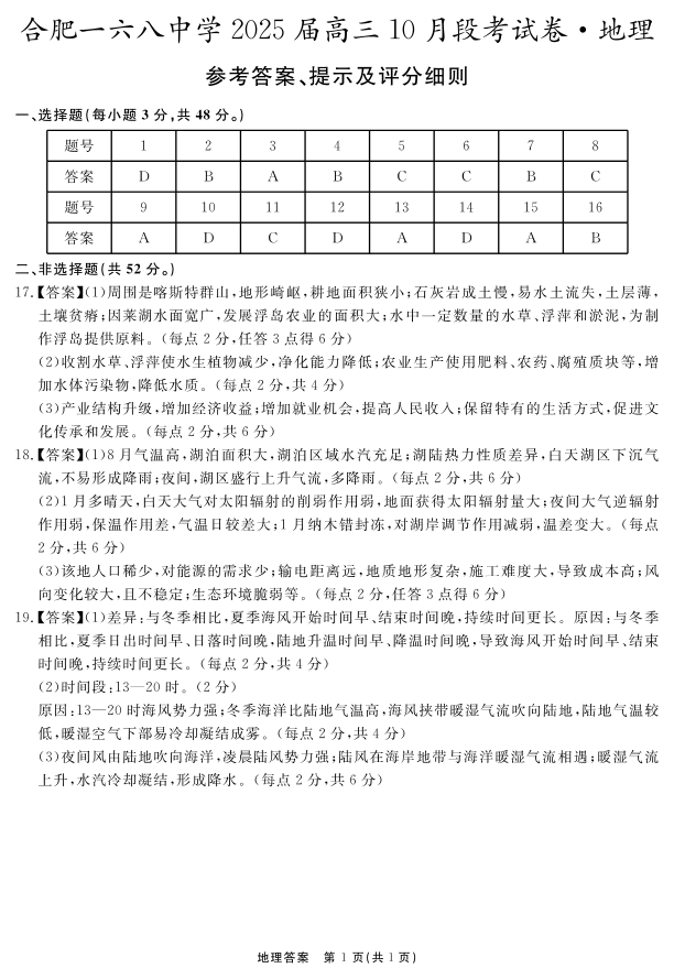 安徽省合肥一六八中学2025届高三上学期10月段考地理答案