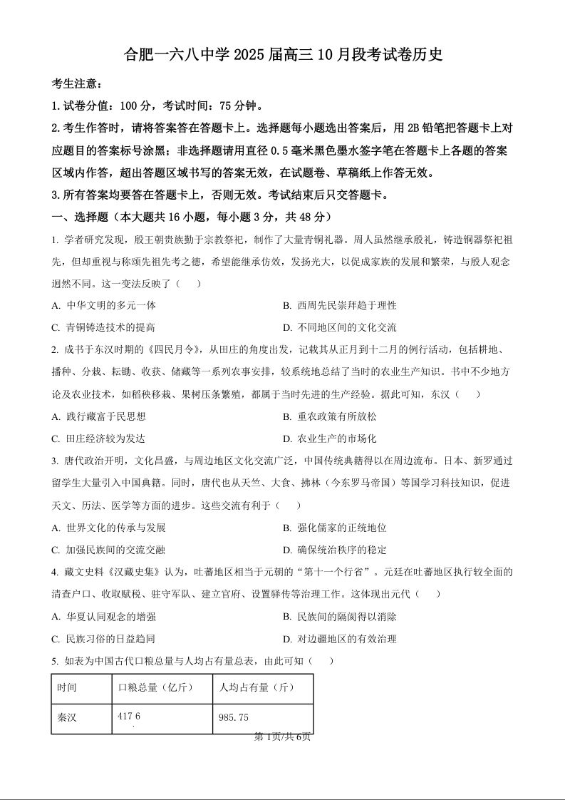 安徽省合肥一六八中学2025届高三上学期10月段考历史