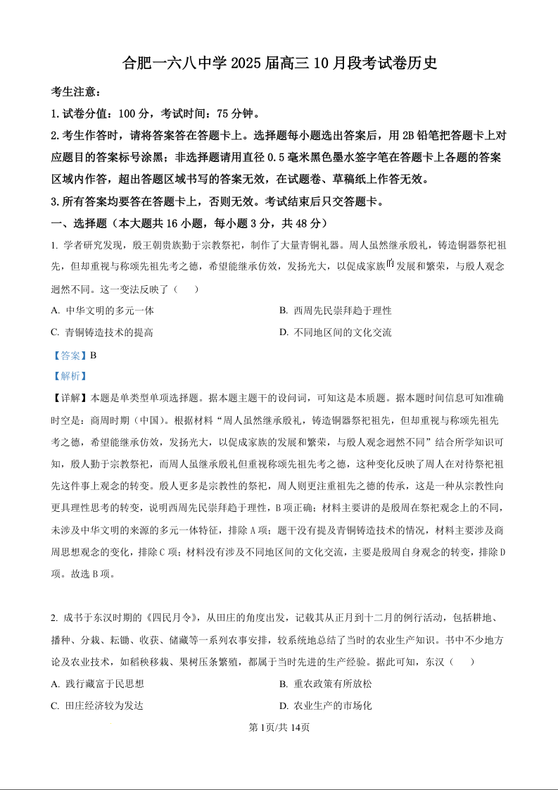 安徽省合肥一六八中学2025届高三上学期10月段考历史答案
