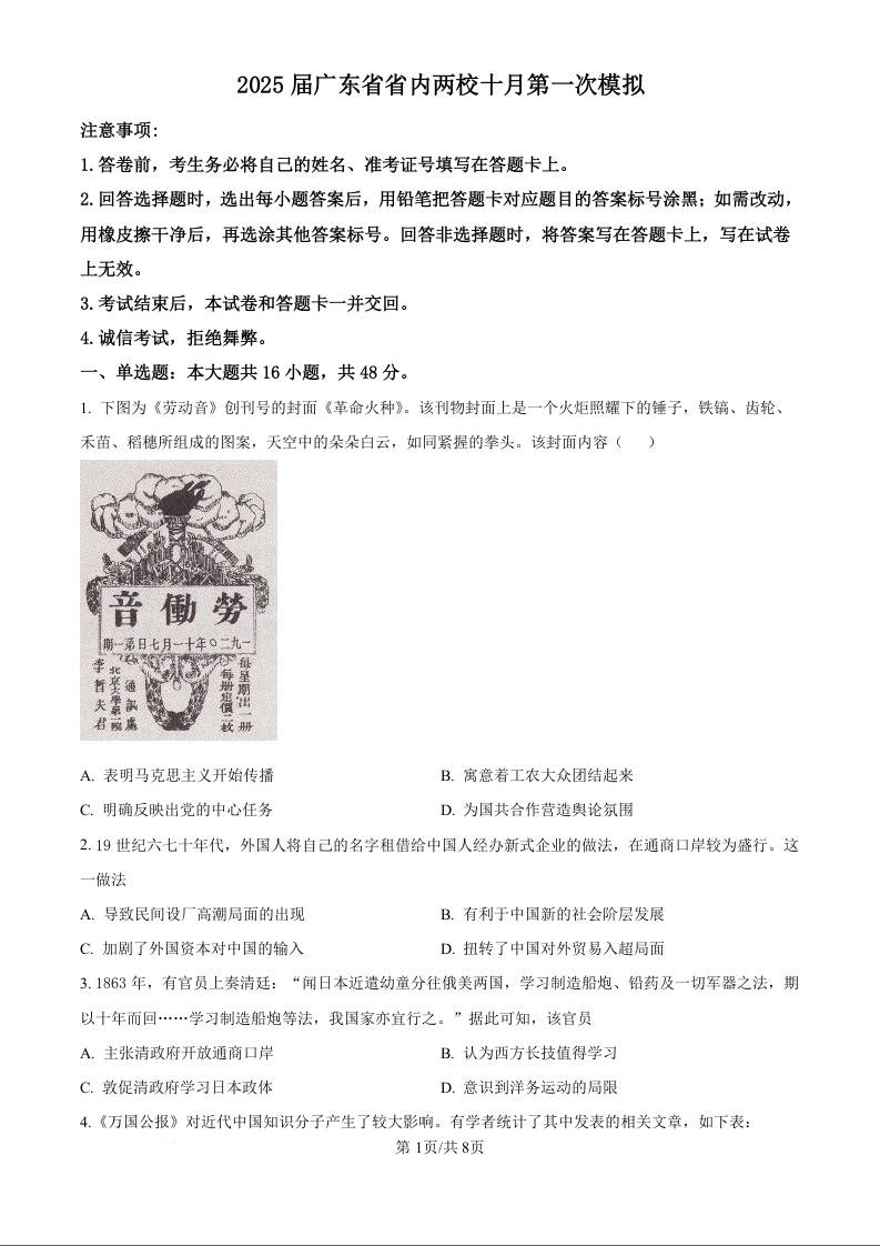 2025届广东省联考高三上学期10月第一次模拟(一模)历史试题