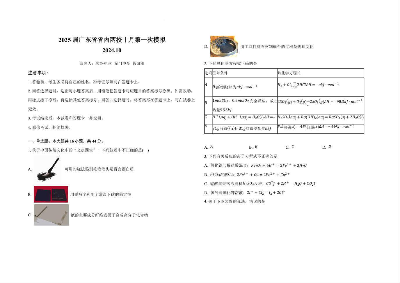2025届广东省联考高三上学期10月第一次模拟(一模)化学+答案