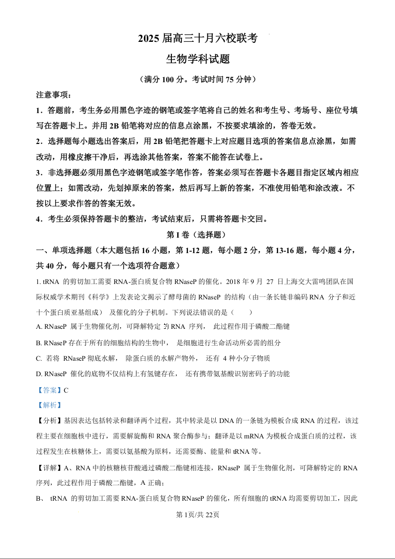 广东省2025届高三10月六校联考生物(解析版)