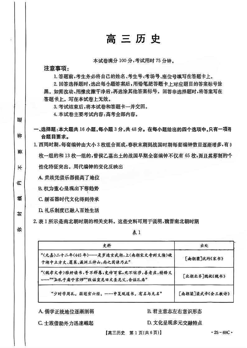 广东省部分高中2025届高三10月大联考历史