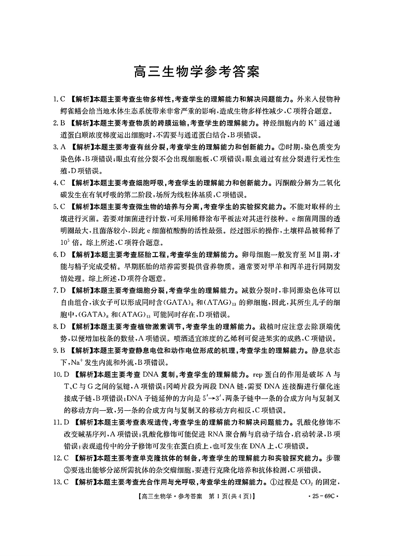 广东省部分高中2025届高三10月大联考生物答案