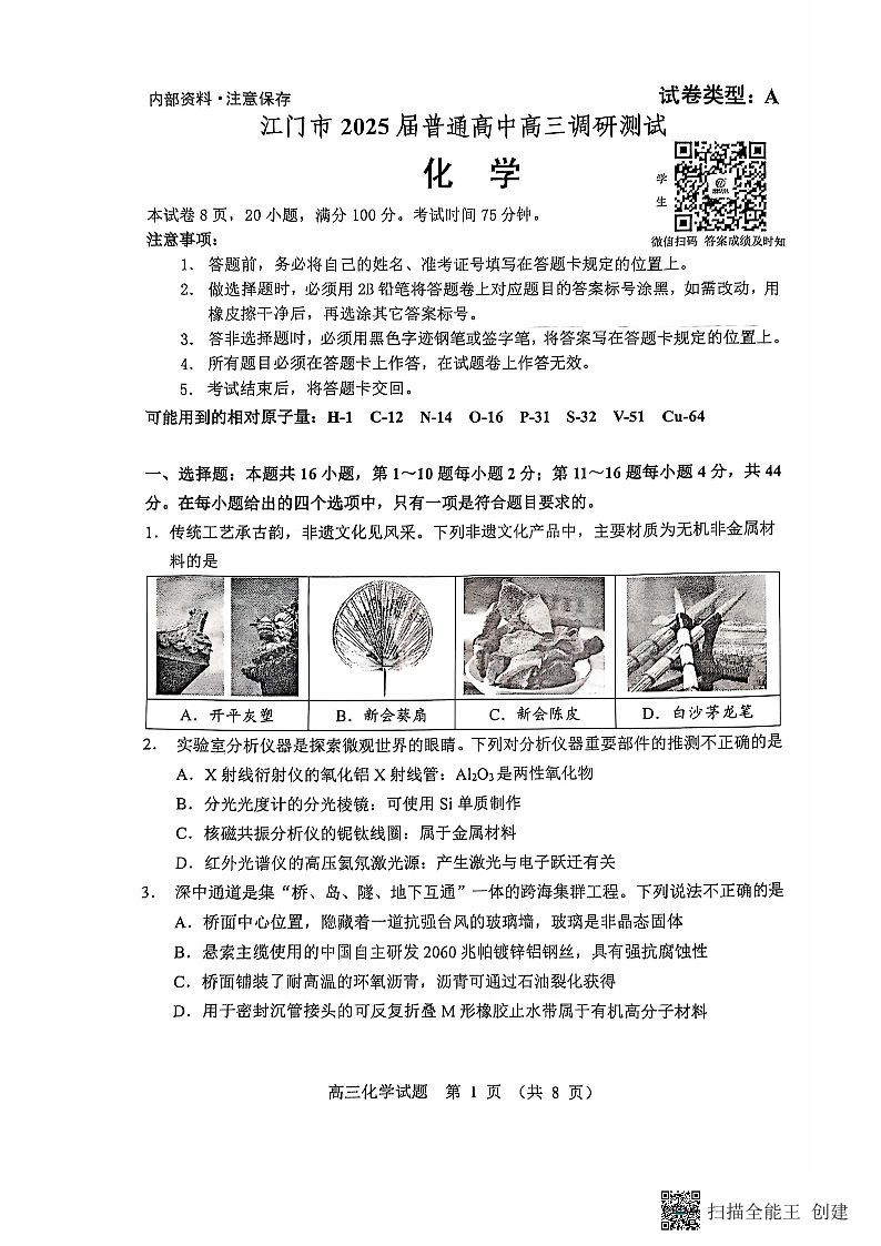 广东省江门市2025届高三上学期10月调研考试化学