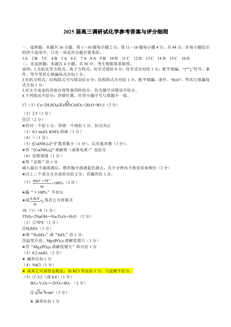 广东省江门市2025届高三上学期10月调研考试化学答案