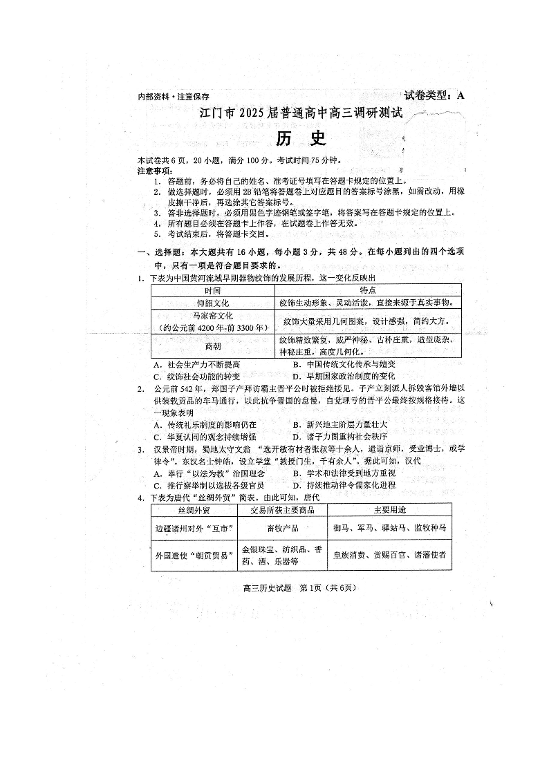 广东省江门市2025届高三上学期10月调研考试历史+答案