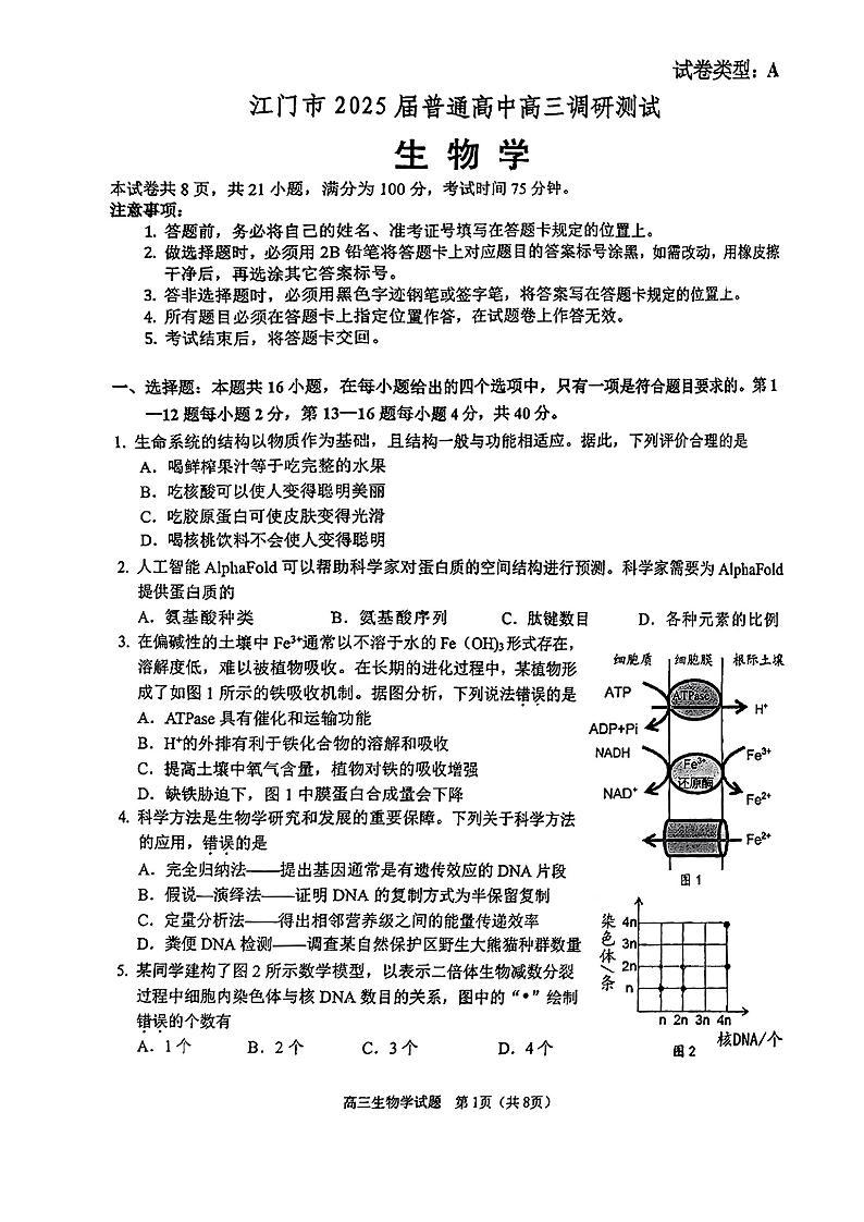 广东省江门市2025届高三上学期10月调研考试生物+答案