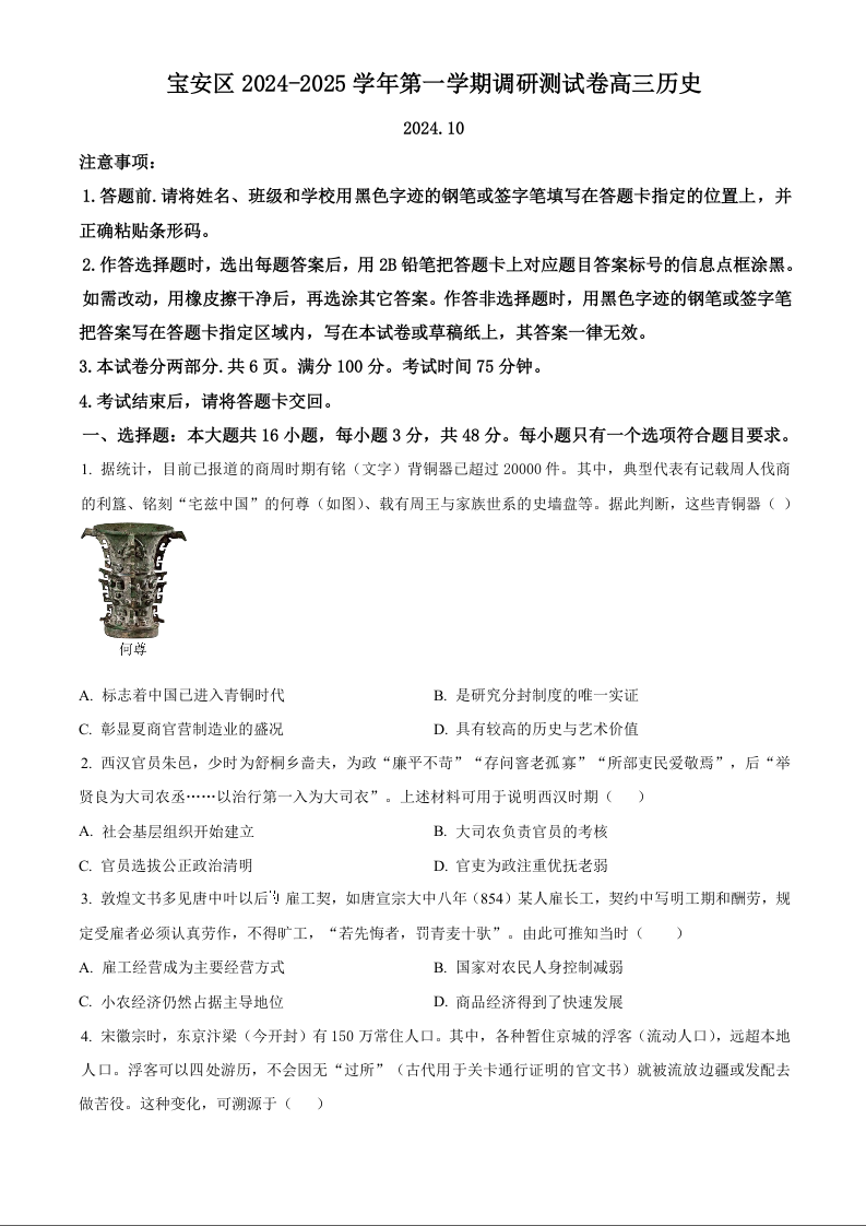 广东省深圳市宝安区2025届高三上学期10月第一次调研测试历史+答案