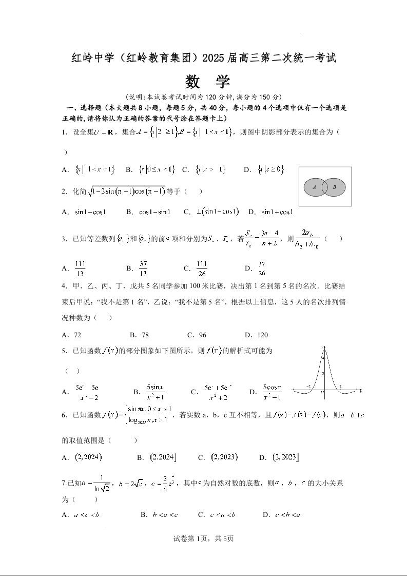 广东省深圳市福田区红岭中学2025届高三上学期第二次统一考试数学