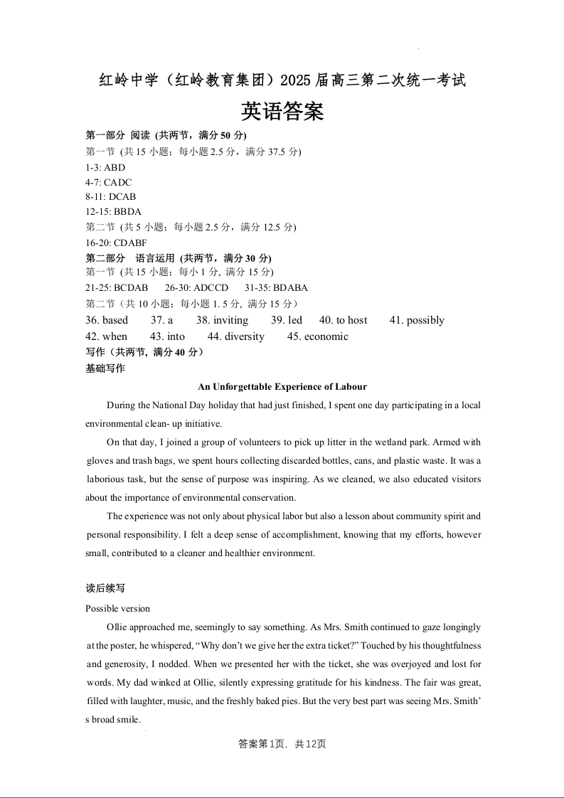 广东省深圳市福田区红岭中学2025届高三上学期第二次统一考试英语答案