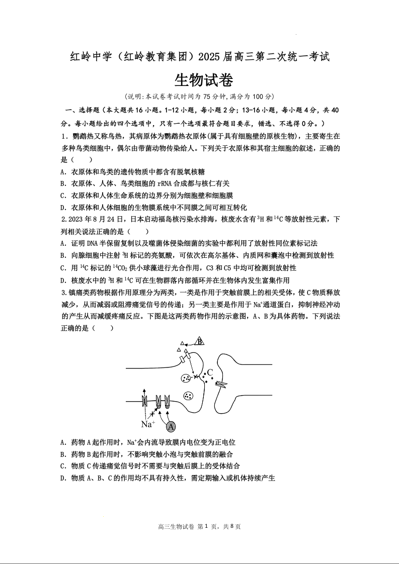 广东省深圳市福田区红岭中学2025届高三上学期第二次统一考试生物