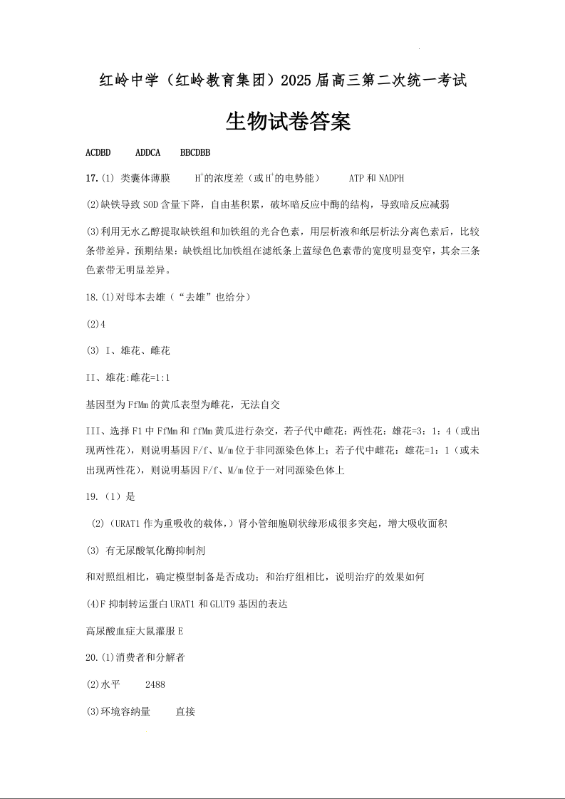 广东省深圳市福田区红岭中学2025届高三上学期第二次统一考试生物答案