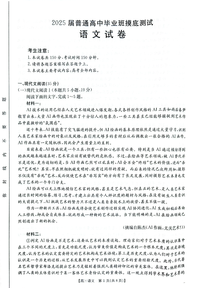广西省南宁市七市联考2025届普通高中毕业班高三摸底测试语文