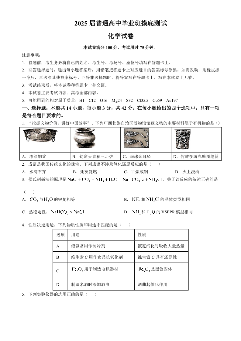 广西省南宁市七市联考2025届普通高中毕业班高三摸底测试化学(含解析)
