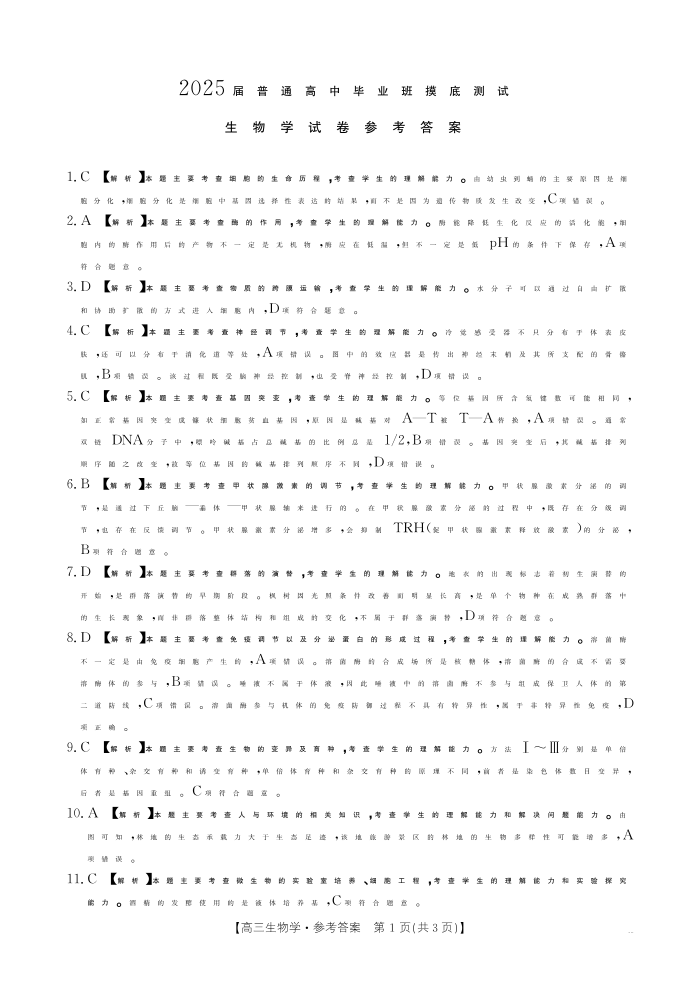 广西省南宁市七市联考2025届普通高中毕业班高三摸底测试生物答案
