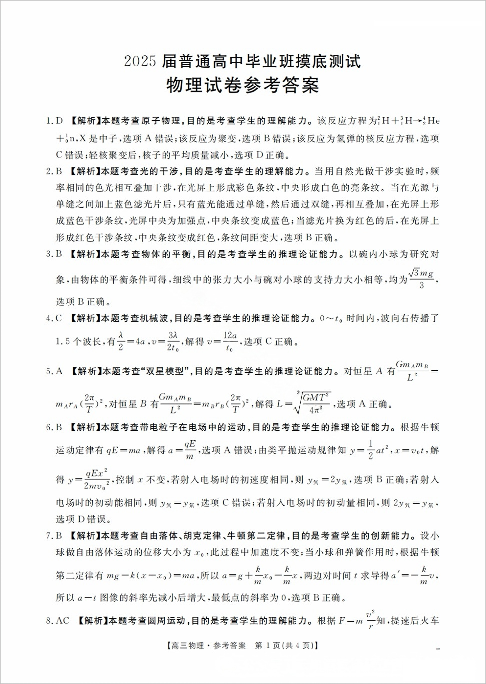 广西省南宁市七市联考2025届普通高中毕业班高三摸底测试物理答案