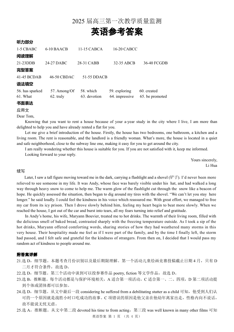 广西省玉林市2025届高三上学期第一次教学质量监测英语答案