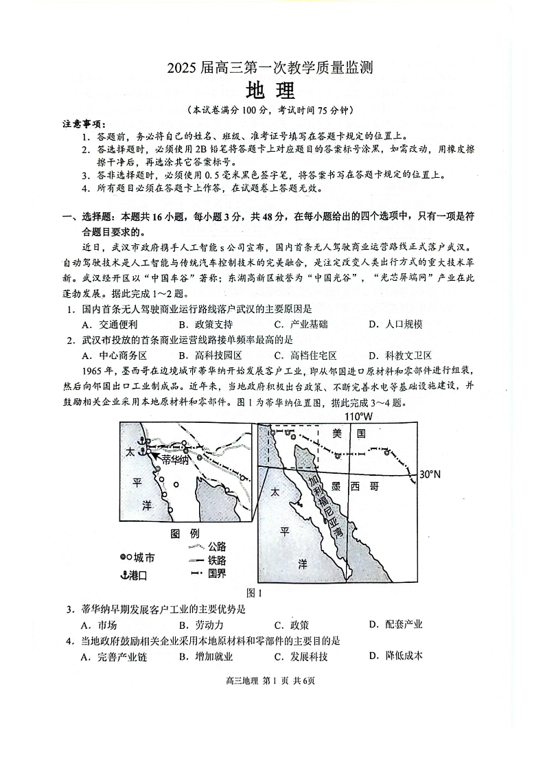 广西省玉林市2025届高三上学期第一次教学质量监测地理