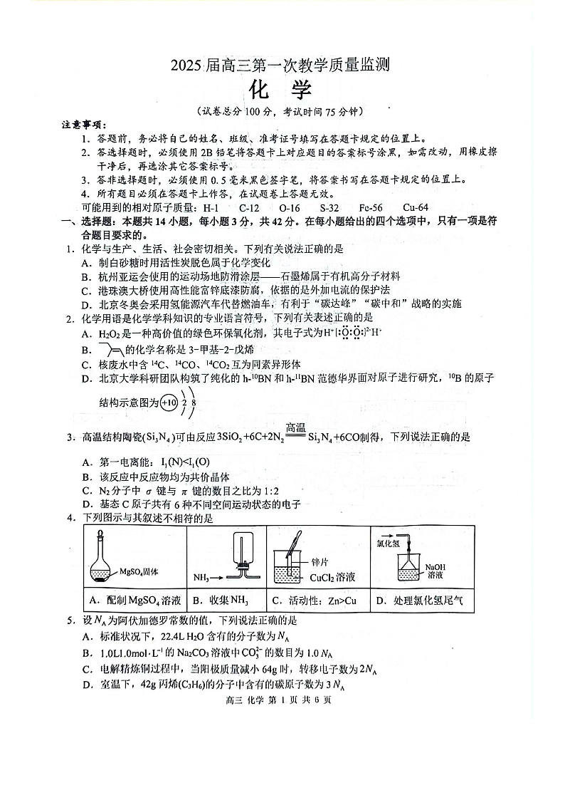 广西省玉林市2025届高三上学期第一次教学质量监测化学