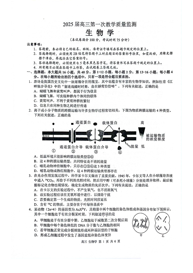 广西省玉林市2025届高三上学期第一次教学质量监测生物