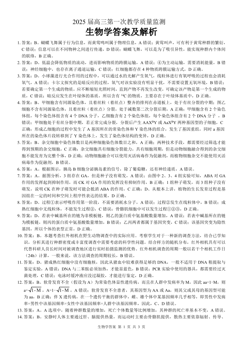 广西省玉林市2025届高三上学期第一次教学质量监测生物答案
