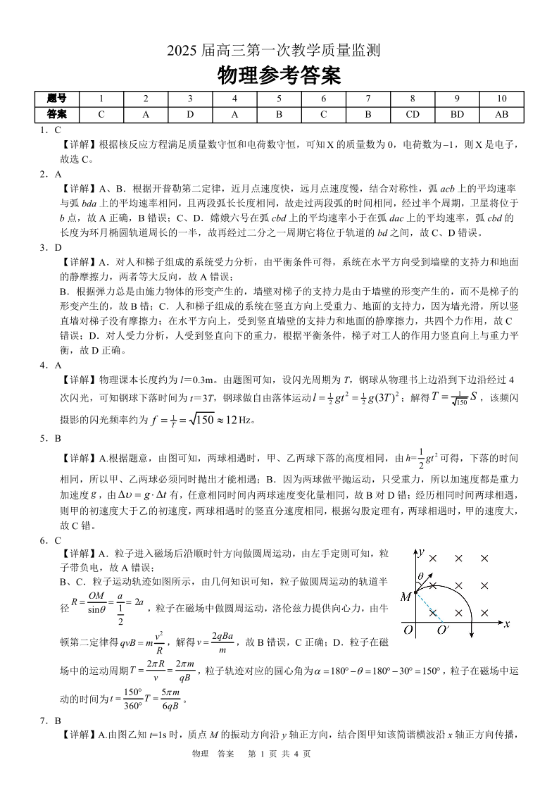 广西省玉林市2025届高三上学期第一次教学质量监测物理答案